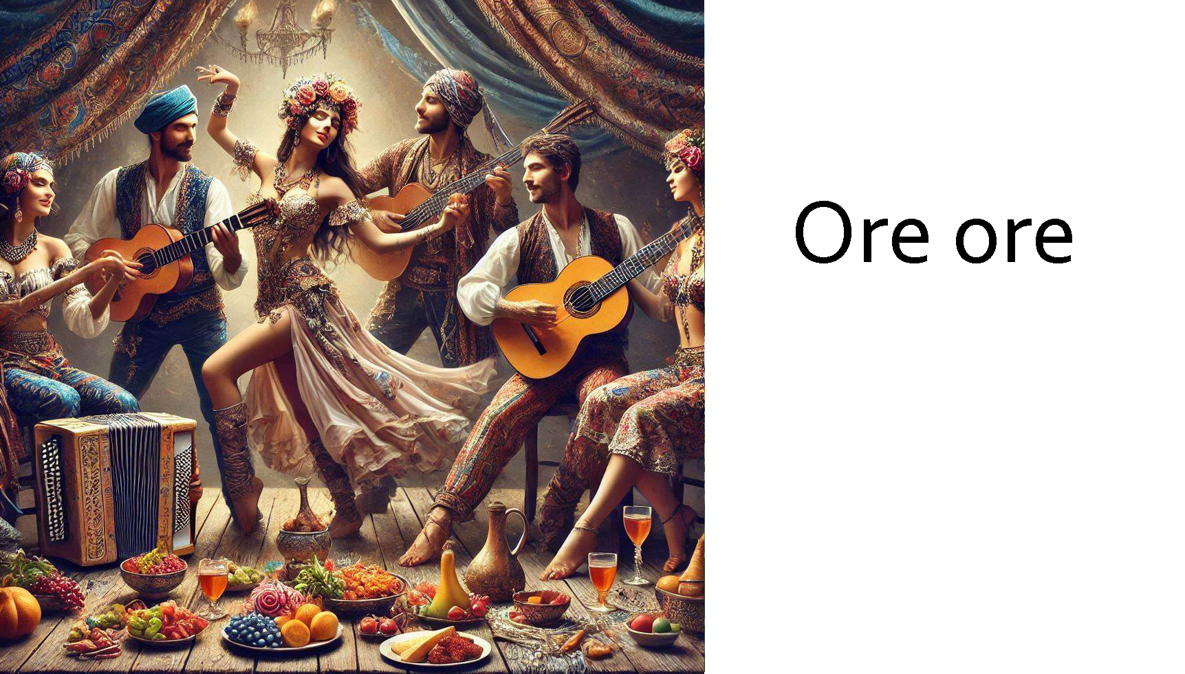 Tekst utworu „Ore, ore” odnosi się do życia Romów, ich tradycji oraz radości związanej z tańcem i muzyką. Refren „Ore ore szabadabada amore” jest przykładem typowego stylu romskiego, który łączy w sobie elementy radości i tęsknoty. Piosenka jest często interpretowana jako wyraz dumy z romskiej tożsamości oraz sposobność do celebrowania kultury[4][5].